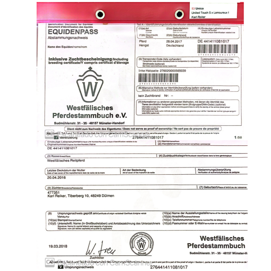 Unico’s equine passport, issued by the Westfälisches Pferdestammbuch e.V., certifies his identity and prestigious breeding. Born on April 28, 2017, in Germany, he is a registered Westphalian Warmblood, descending from the renowned sire United Touch S. This official document not only confirms his lineage but also provides critical details about his health and identification, including his microchip number. With a pedigree that reflects top-tier breeding standards, Unico’s passport ensures his value in both competition and potential future breeding programs.